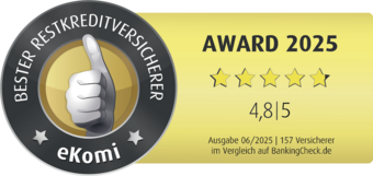 Zahlreiche Rezensionen erreichen uns täglich über das Bewertungsportal eKomi. Mit einer sagenhaften Bewertung von durchschnittlich 4,8 von 5 Sternen sind wir mit dem eKomi & BankingCheck Award 2024 als bester Restkreditversicherer ausgezeichnet worden! Wir freuen uns über diese Auszeichnung und setzen alles daran, unseren Kundenservice mithilfe dieses wertvollen Feedbacks stetig bedarfsgerecht weiterzuentwickeln.